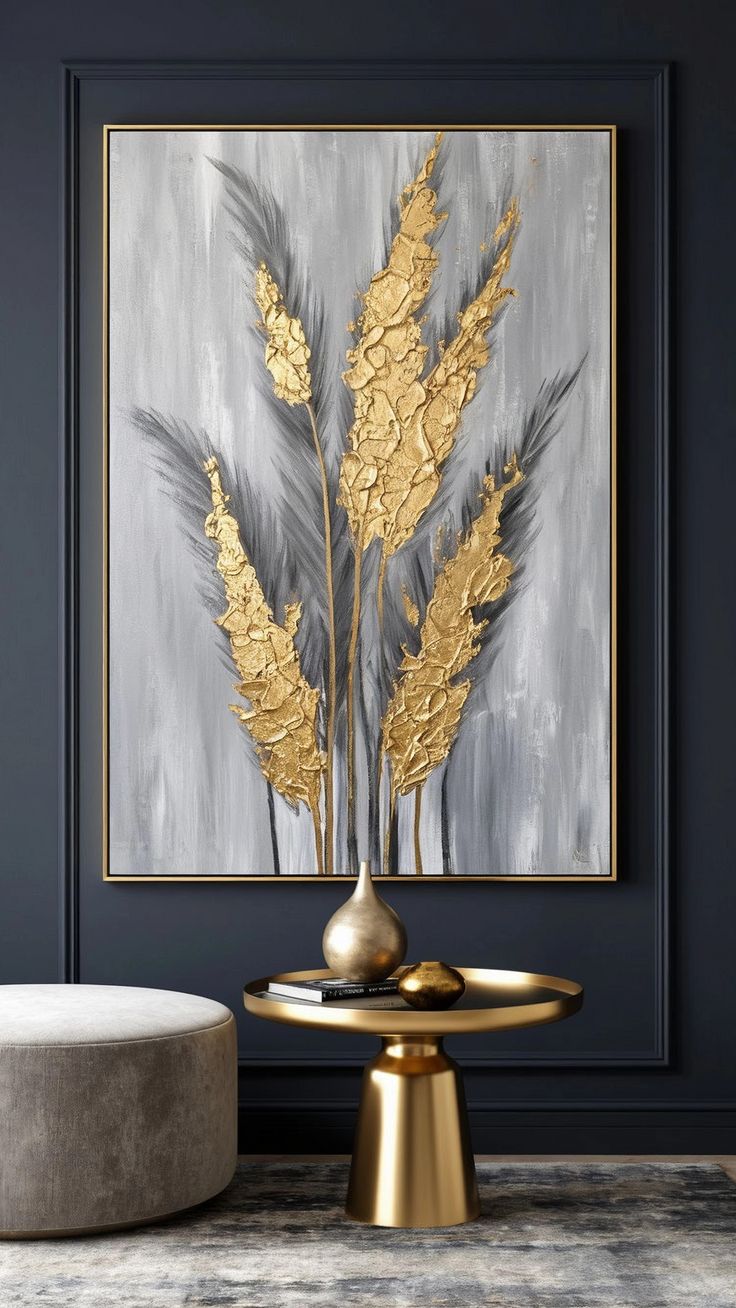 Im Zentrum der Komposition stehen hohe, filigran gestaltete goldene Blätter, die sich anmutig vor einem Hintergrund aus sanften Grauabstrichen erheben. Der Kontrast zwischen metallischem Gold und zurückhaltendem Grau vermittelt Ruhe und Größe – ideal für Räume, die Minimalismus und Luxus verbinden möchten.
